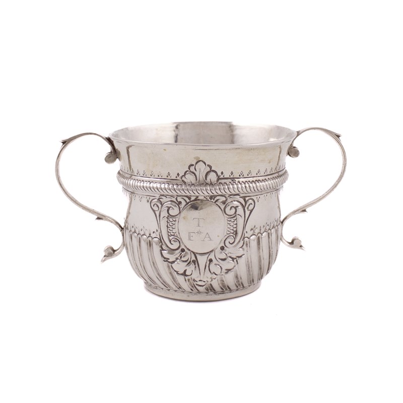 circular form, part-fluted decoration, a gadrooned band with a central scroll cartouche, scratched initials 'T' over 'F.A', scroll handles, length handle to handle 17.4cm, approx. weight 7.8oz.