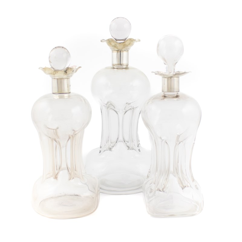 by William Hutton and Sons, Birmingham 1928, hour-glass form, plain mount, plus two smaller similar decanters, one by the same maker, Sheffield 1901, and one by Mappin and Webb, Birmingham 1910, height of tallest 29cm. (3)