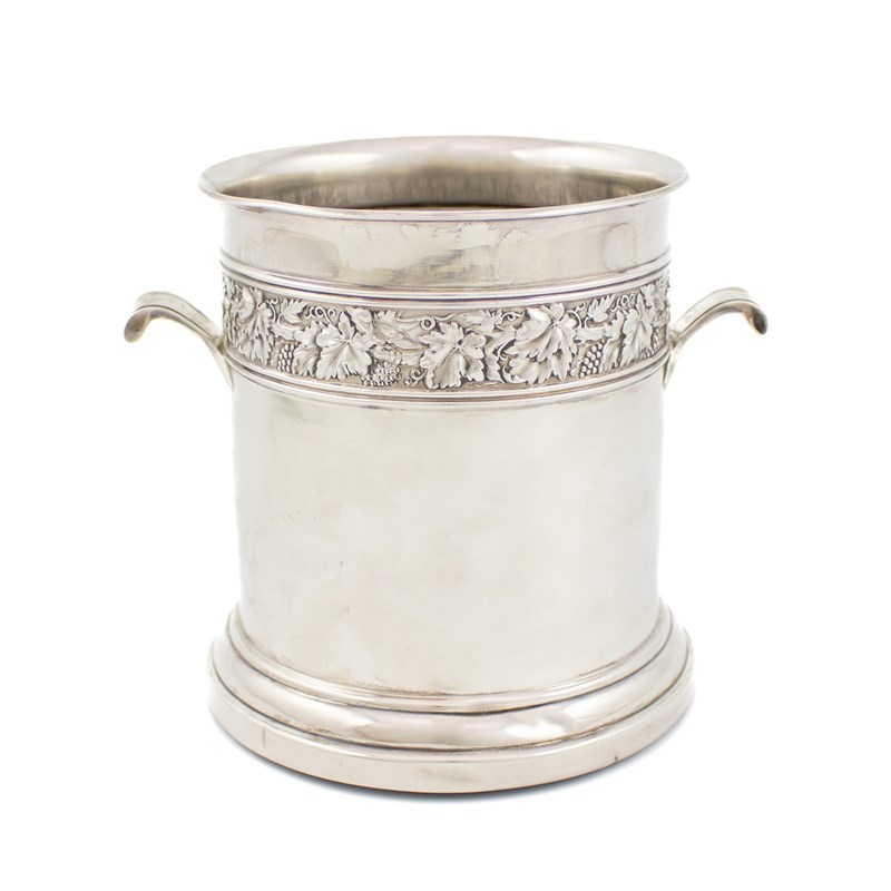 cylindrical form, a band of vine and grape decoration, scroll handles, on a raised circular foot, the underside wood lined, height 14.8cm.