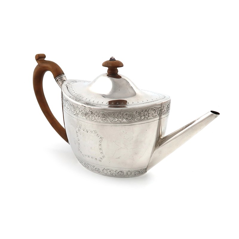 oval form, wooden scroll handle, bright-cut decoration, two vacant cartouches, domed hinged cover with knop finial, length handle to spout 29.6cm, approx. weight 15.7oz.