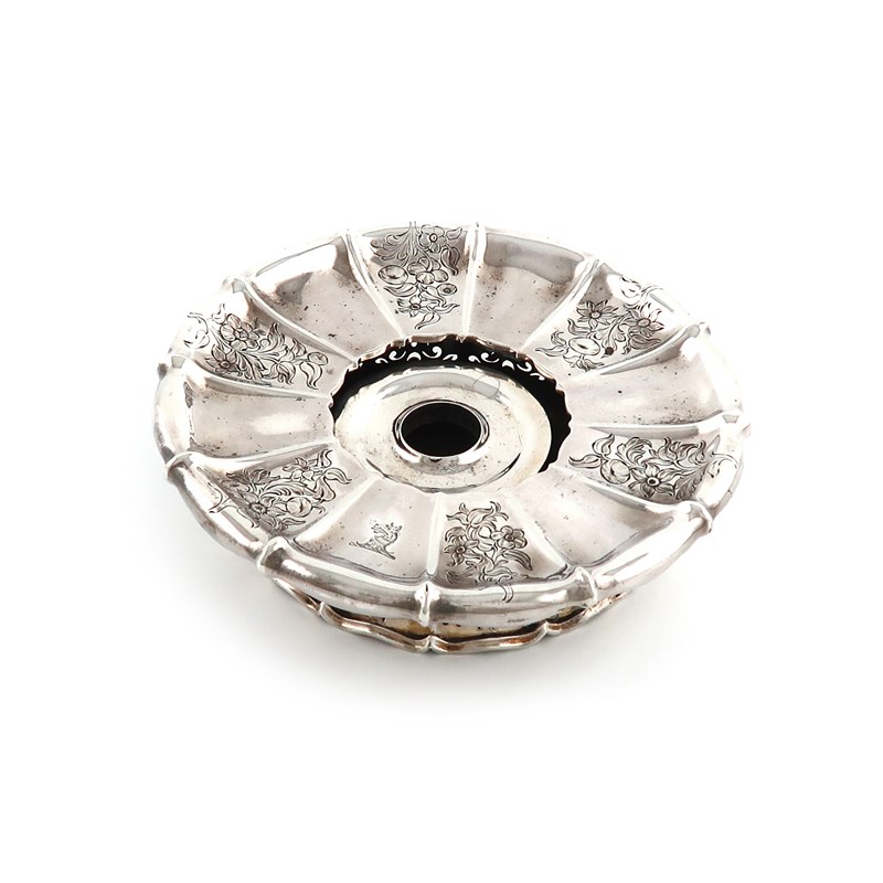 lobed tapering circular form, with alternate panels of engraved foliate decoration, engraved with a crest, with pierced scroll decoration to the sides, with a burner, diameter 17.5cm, approx. weight 14.2oz.