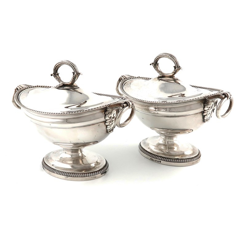 plain oval form, with two drop-ring handles with acanthus leaf decoration, gadrooned borders, domed pull-off cover with reeded and foliate ring handle, (unmarked), on a raised oval base, numbered '1' and '3', length handle to handle 20.6cm, approx. weight 45oz. (2)