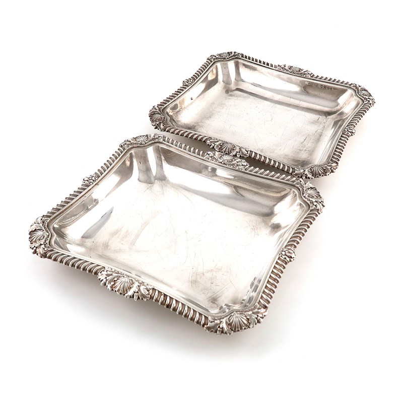 shaped rectangular form, oak leaf, shell and gadroon border, engraved with a crest, length 27.7cm, total approx. weight 61.3oz. (2)