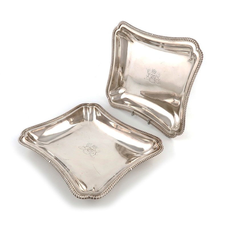 shaped rectangular form, gadroon border, engraved with an armorial, the undersides with scratch weight 'N.1' over '22.0' and 'N.3' over '22.14', length 26.4cm, total approx. weight 43.2oz. (2)