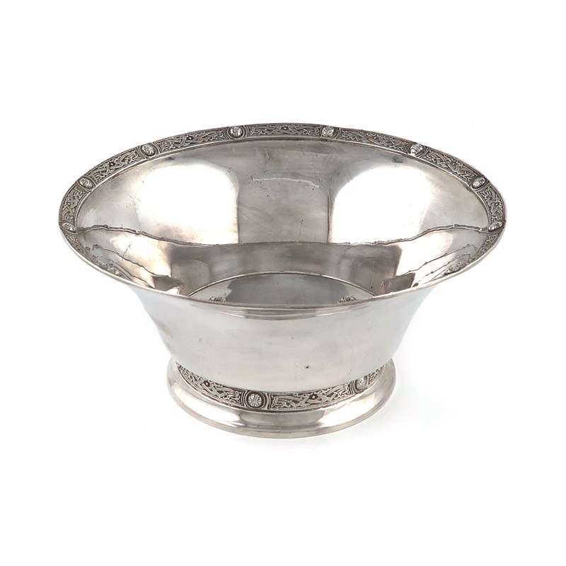 circular form, border chased with Celtic strap-work and bosses, on a raised circular foot with similar border, diameter 20.2cm, approx. weight 13.6oz.