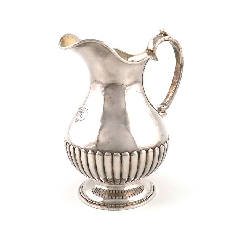 baluster form, part fluted, engraved with a crest, gilt interior, with a scroll handle, on a raised circular base, height 16.3cm, approx. weight 12.4oz.