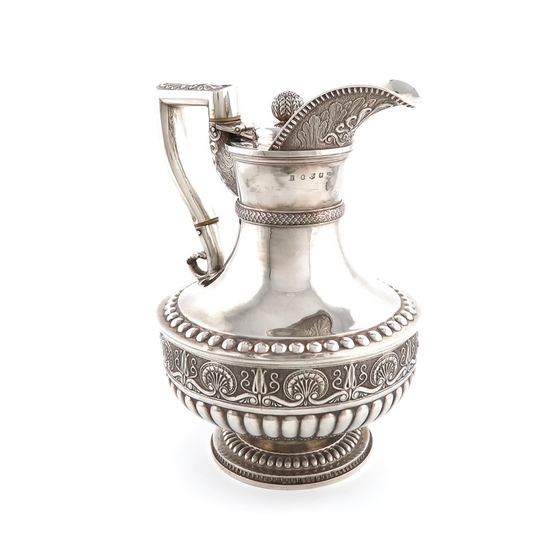 baluster form, part-fluted, shell and scroll border with large beading above, laurel leaf girdle to the neck, angular scroll handle with anthemion thumbpiece and shoulder and a shell terminal, ivory insulators, anthemion-capped spout with gadroon border, the hinged stepped cover with a bud finial, on a raised circular foot with gadroon border, height 24.2oz, approx. weight 33oz.