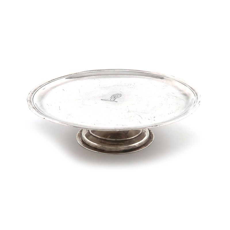 circular form, on a raised circular foot, the centre engraved with a crest, the underside with scratch weight '81.8', diameter 16.2cm, approx. weight 8.5oz.
