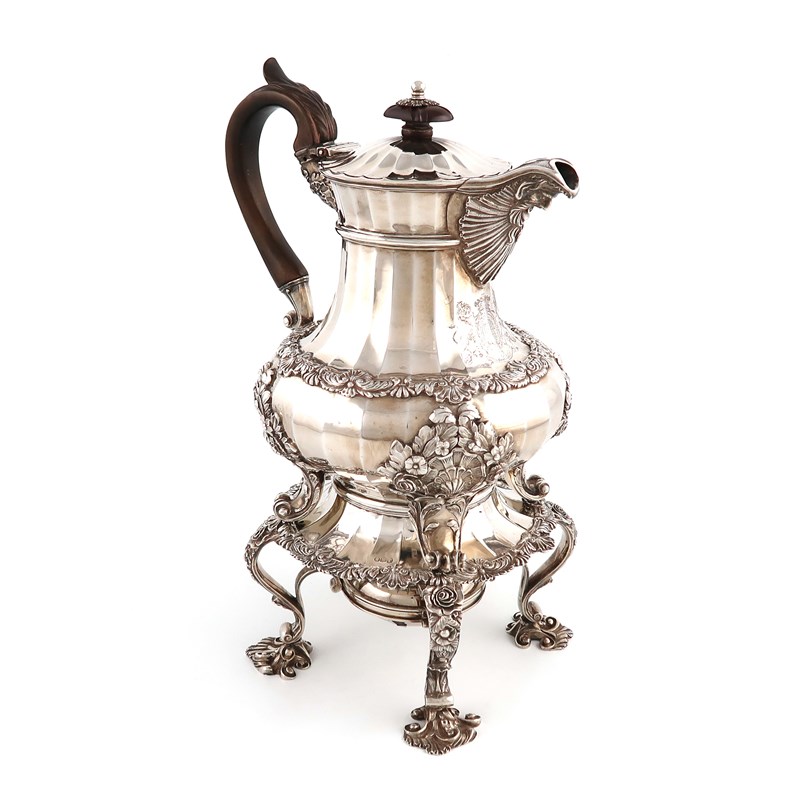 ribbed baluster form, shell and foliate scroll girdle, engraved with an armorial, the spout with a sea god mask, leaf-capped scroll handle and finial, on four flower and shell-capped scroll feet, the ribbed stand with shell and foliate scroll border, on four floral scroll feet, total height 31.5cm, total approx. weight 66.4oz.