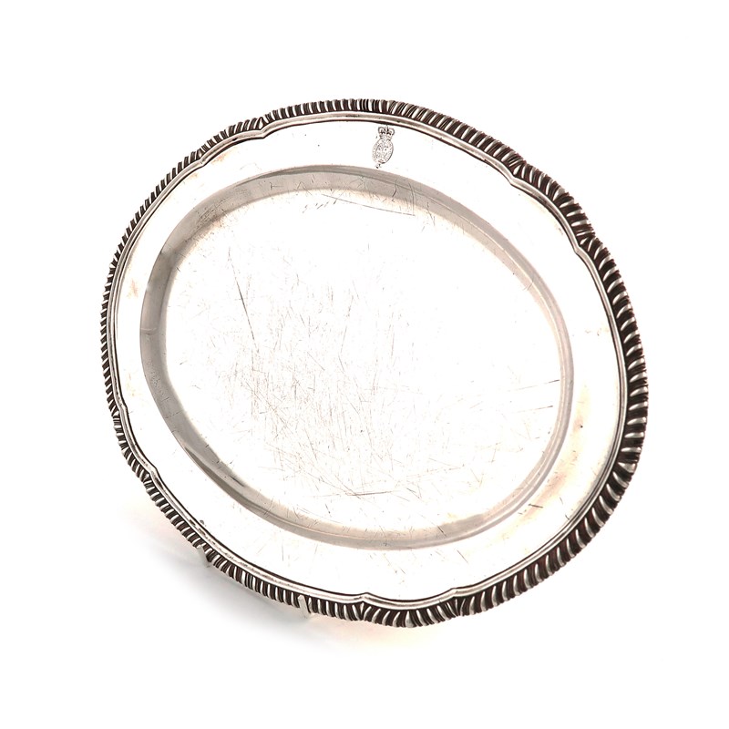 shaped oval form, gadroon border, engraved with a crest, scratch weight '12 34 19' to underside, length 38.2cm, approx. weight 34.5oz.