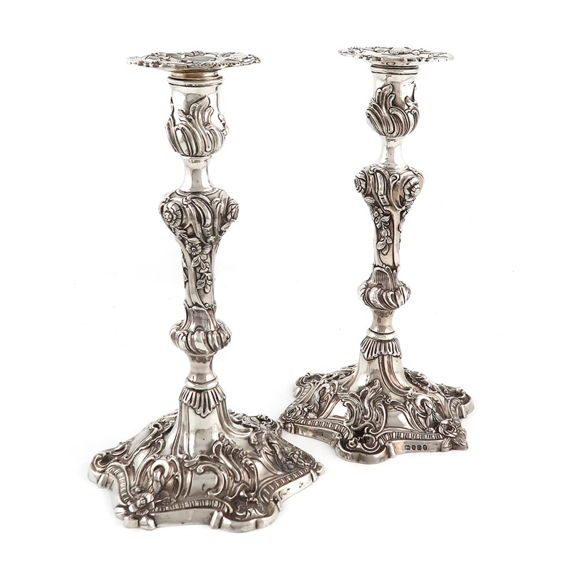 knopped rocaille stems, urn-shaped capitals chased with foliate scroll-work, removable drip-pans with floral scroll borders, on a raised spread foot chased with rocaille, foliate scroll-work and a gadroon and rosette border, height 27.7cm, total approx. weight 67.5oz. (2)