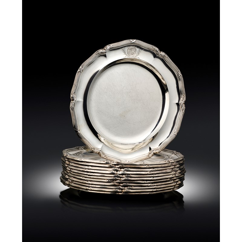 These dinner plates are from the Pelham service, originally commissioned by Charles Anderson Pelham from John Parker and Edward Wakelin, possibly to commemorate his marriage to Sophie Aufrere in 1770. The design was developed, at least in part, by Sir William Chambers, and this initial service is recorded in Parker and Wakelin's 'Workman’s and Gentleman’s Ledgers', now in the Victoria and Albert Museum. In 1808, Pelham then commissioned Paul Storr to create an addition to this service, of which the set offered here was a part.