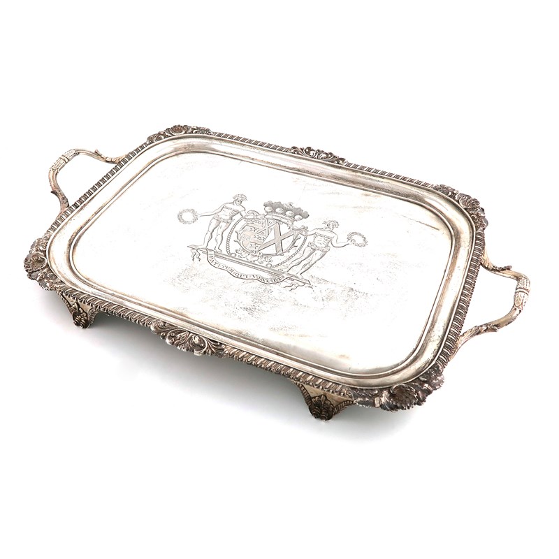 rounded rectangular form, gadroon, foliate shell and oak leaf border, the centre engraved with an armorial, foliate scroll handles, on four honeysuckle bracket feet, length handle to handle 67.7cm, approx. weight 158oz.