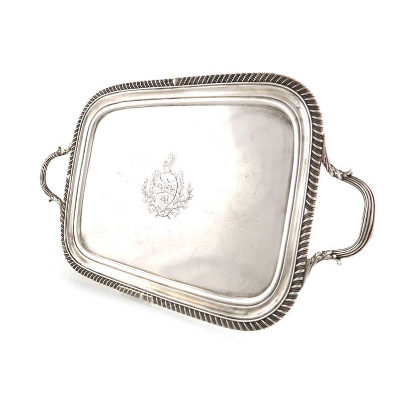 rounded rectangular form, gadroon border, reeded handles with foliate shoulders, the centre engraved with an armorial, the reverse engraved 'ICH to JL Nov. 4, 1815.', length handle to handle 59cm, approx. weight 66.3oz.