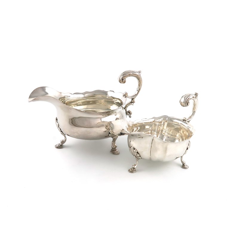 oval form, wavy-edge border, leaf capped scroll handle, on three hoof feet, length 18cm, plus a sauce boat, by Nathan and Hayes, Chester 1903, oval form, leaf capped scroll handle, approx. total weight 14.5oz. (2)