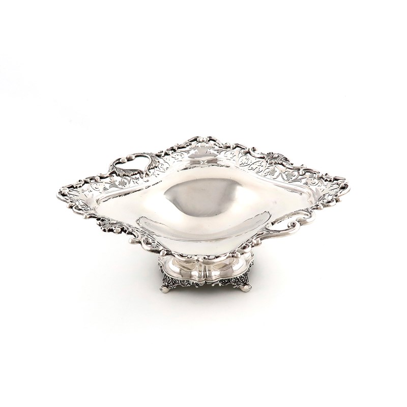 shaped square form, inset handles, pierced foliate border, on a raised shaped square foot on four bracket feet, length 22.4cm, approx. weight 16.7oz.