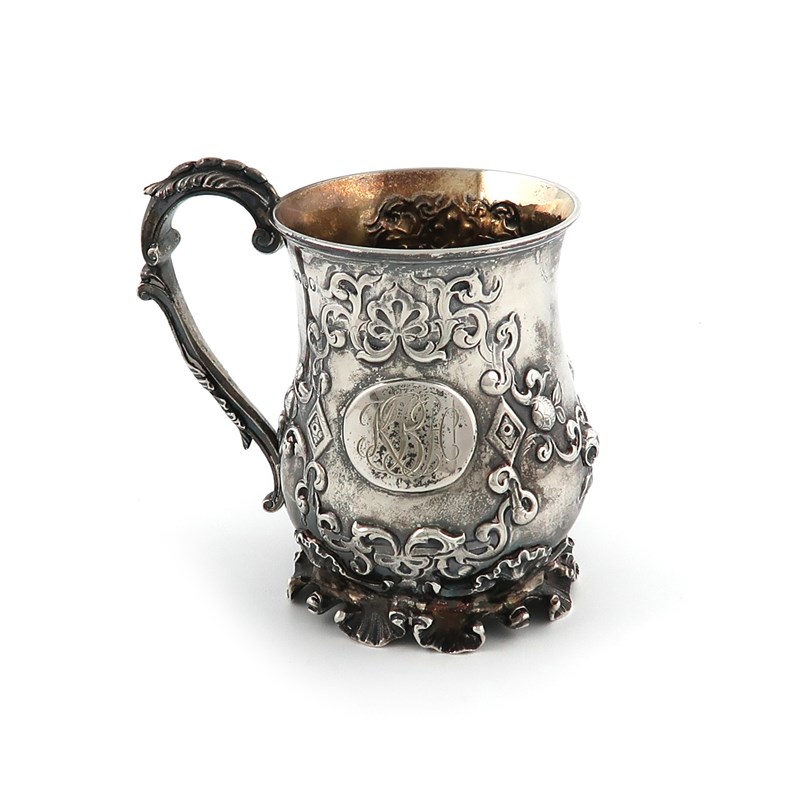baluster form, embossed decoration, leaf-capped handle, applied with an initialled cartouche, height 11cm, approx. weight 7oz.