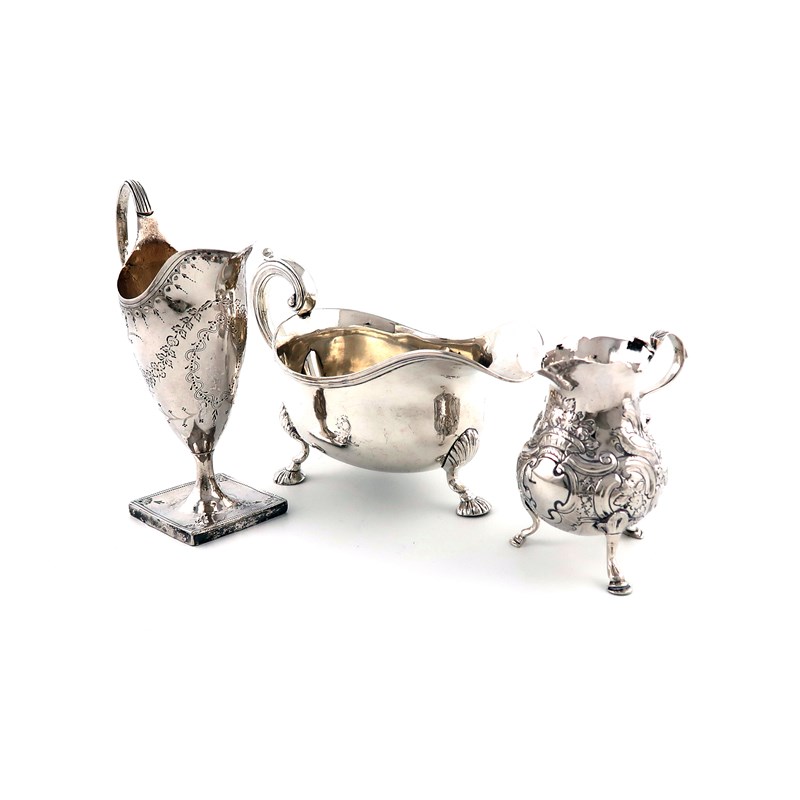 oval form, scroll handle, the base with a reservoir for hot water, and with a hinged cover, on four pad feet, engraved with a crest, length 18cm, plus a George III silver helmet cream jug, London 1788, and George II silver baluster cream jug, London 1758, approx. weight 14.7oz. (3)