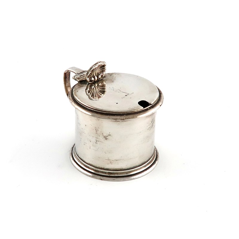 plain drum form, the hinged cover with a shell thumb-piece, engraved with a crest, with a later blue glass liner, height 7cm, approx. weight 4oz.
