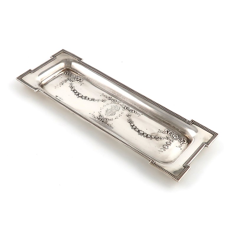 rectangular form, beaded borders, the centre with ribbon-tied garlands, with a monogram, length 24.3cm, approx. weight 4oz.