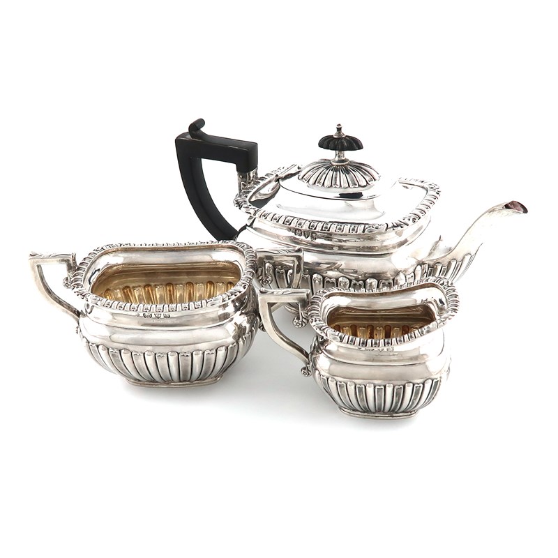 rounded rectangular form, part-fluted decoration, gadroon borders, scroll handles, length handle to spout 23.2cm, total approx. weight 18.58oz. (3)
