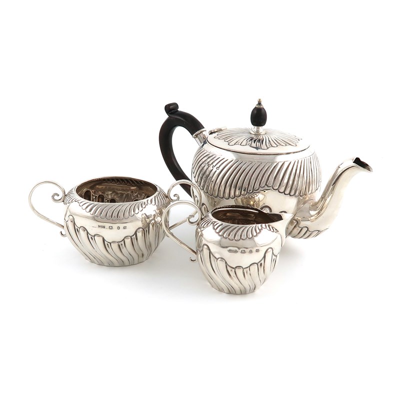 circular form, part-fluted decoration, scroll handles, length handle to spout 20.5cm, approx. weight 15.7oz. (3)