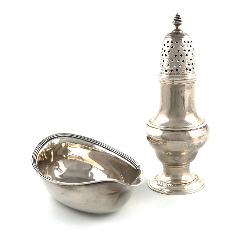 oval form, reeded border, length 12.2cm, plus a George III silver pepper pot, London 1775, baluster form, height 12.7cm, approx. weight 3.8oz. (2)