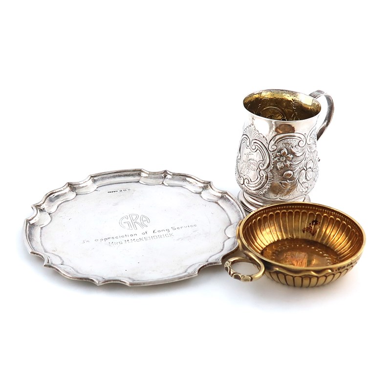comprising: a waiter by John Turnton & Co, Sheffield 1971, shaped circular form, with moulded reeded rim, with engraved logo and inscription, plus a George II mug by Charles Chesterman, London 1753, circular form, scroll handle, later embossed decoration, with an initialled cartouche and crest, and a silver-gilt wine taster by C J Vander Ltd, London 1973, circular form, with engraved fluted decoration, and snake decorated ring handle, height 7.8cm, approx. weight 10.3oz. (3)