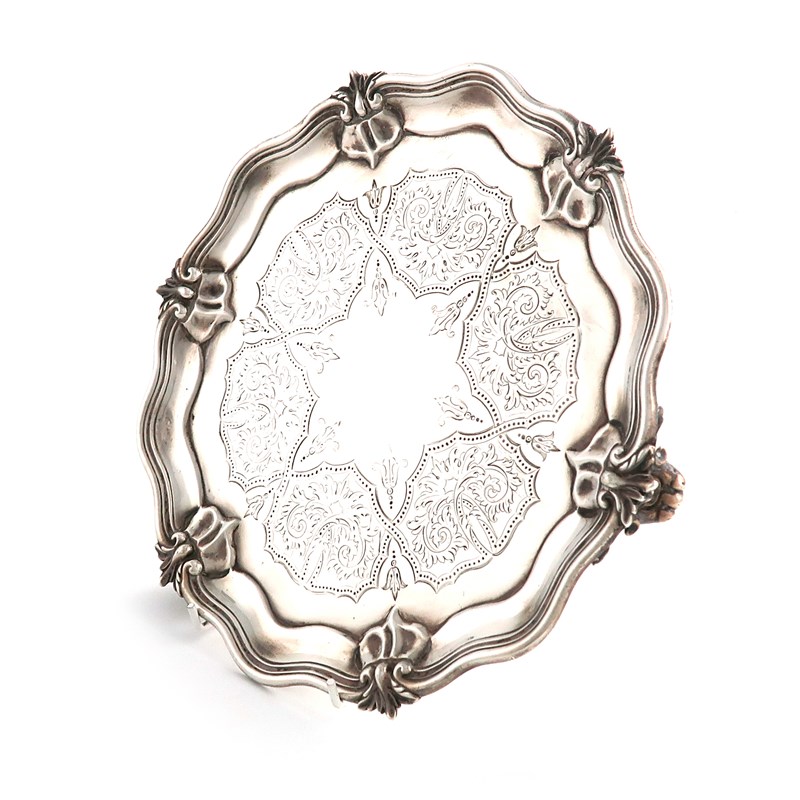 circular form, foliate and scroll moulded border, the centre with engraved foliate scroll decoration, on three foliate bracket feet, diameter 26.2cm, approx. weight 16.5oz.