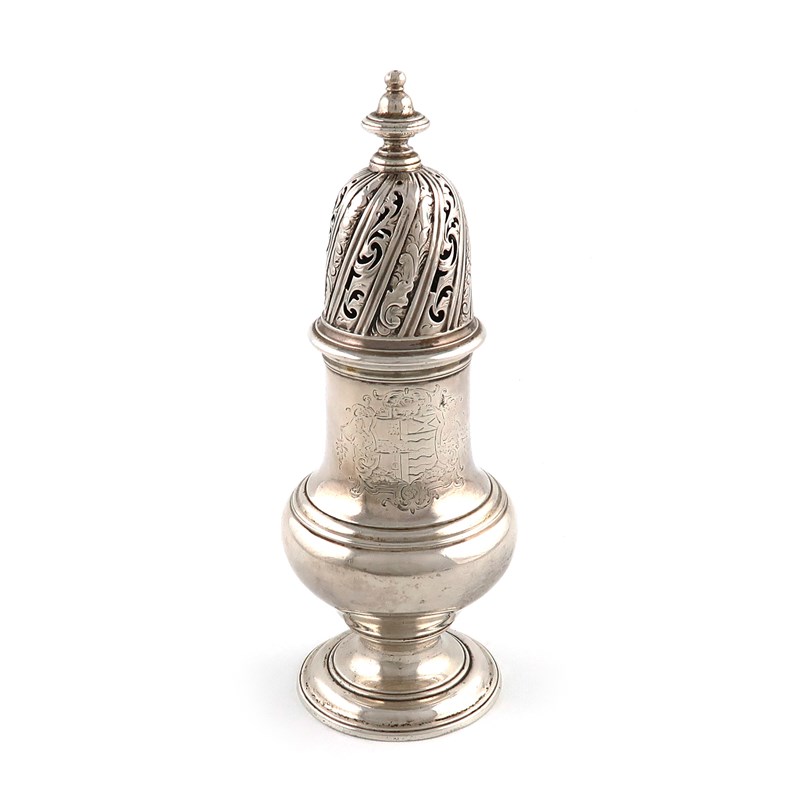 baluster form, pull-off pierced cover with a knop finial, engraved with an armorial, on a raised circular foot, height 17cm, approx. weight 7.75oz.