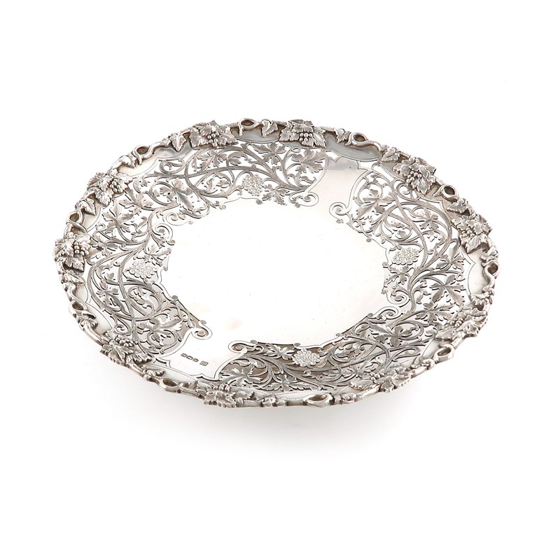 circular form, pierced with trailing grapevines, the border with further embossed grapevines, on a circular foot, diameter 26.5cm, approx. weight 25.6oz.
