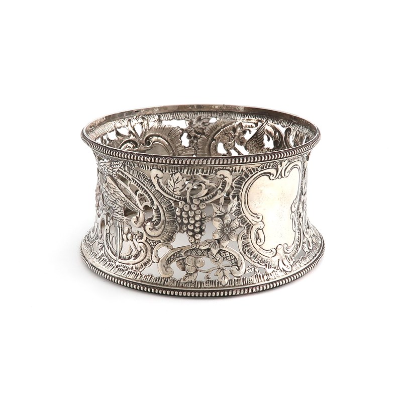 circular tapering form, beaded borders, pierced and embossed with birds, grapes and foliate scroll decoration, diameter 18.3cm, approx. weight 13oz.