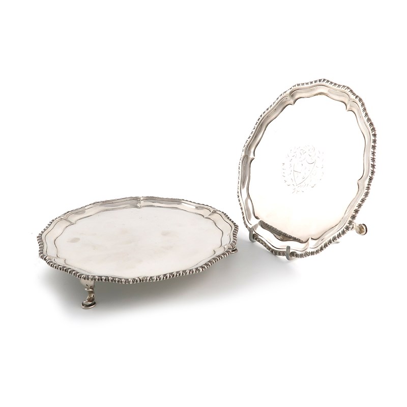 circular form, gadroon border, the centre with an armorial, on three hoof feet, diameter 17.5cm, plus a similar George III silver waiter, by the same maker, London 1773, gadroon border, on three hoof feet, diameter 18.8cm, approx. weight 18.5oz. (2)