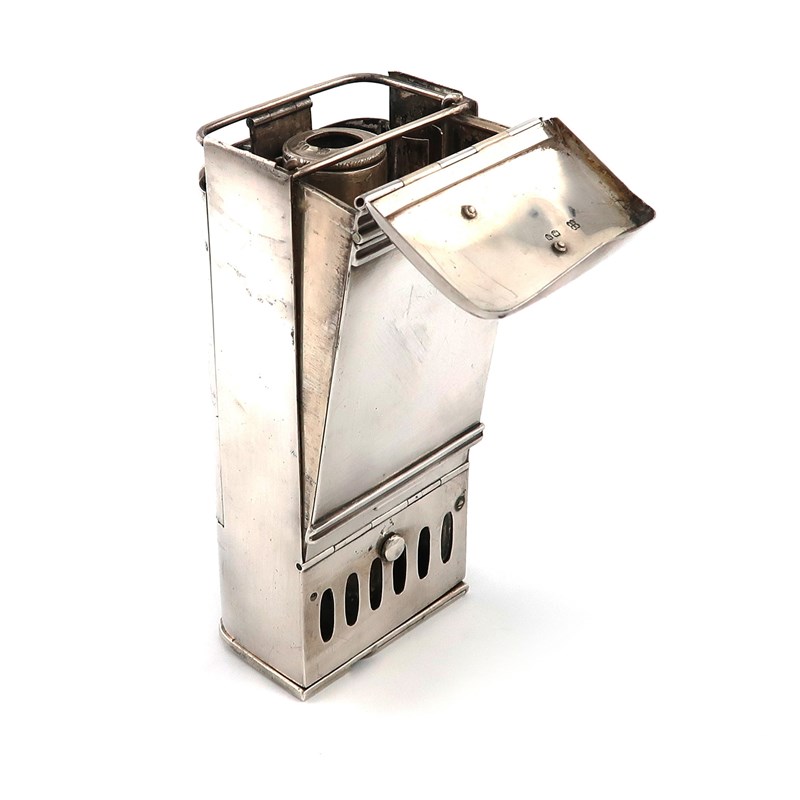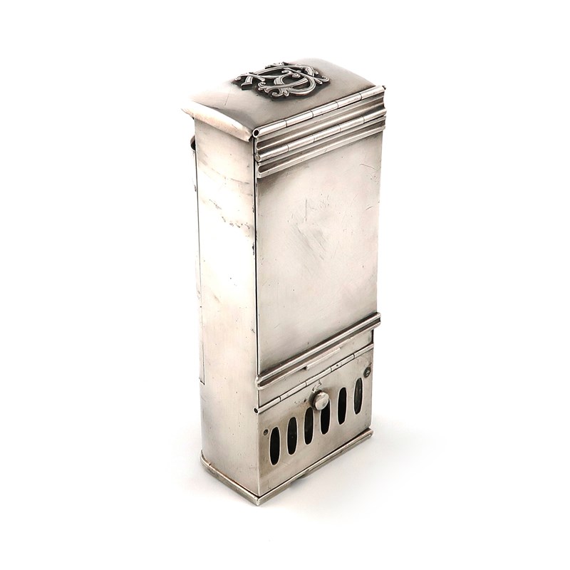 rectangular form, hinged front cover, with a hinged top cover with applied monogram initials, the reverse with a ring attachment and spike supports, the base with turning supports for table use, with a vesta compartment and hinged cover with a striker, height closed 15.5cm.
