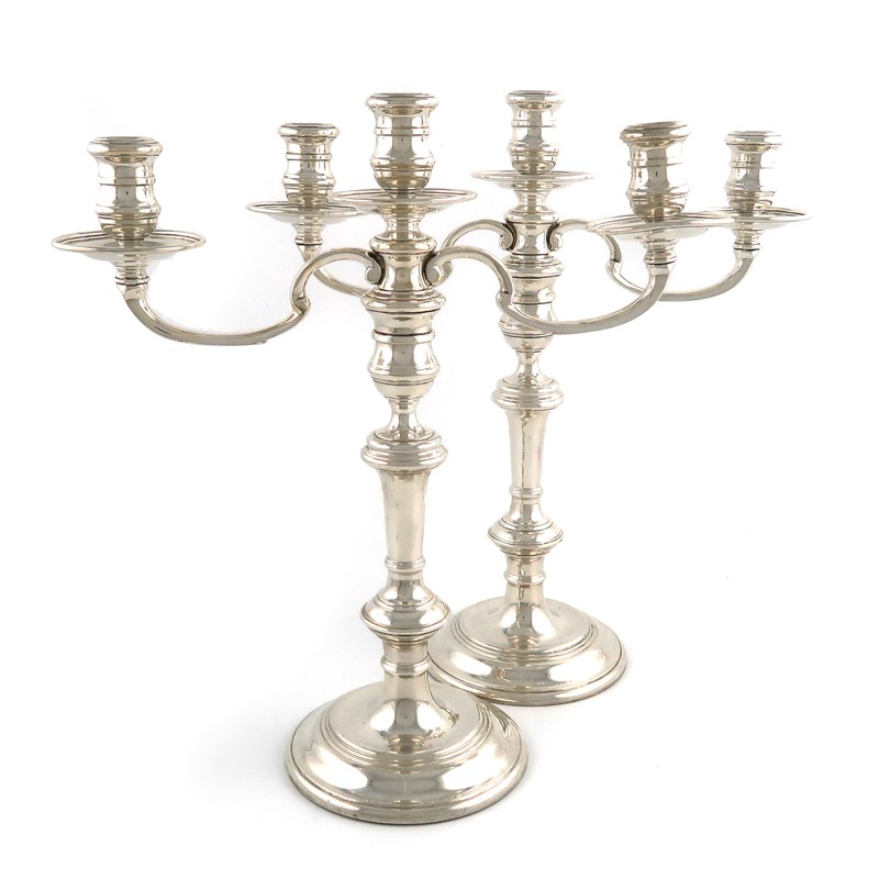 in the George I manner, knopped baluster stems, spool-shaped capitals, scroll branches, on raised filled circular bases, height 35.5cm, approx. weight of branches 23.3oz (2)