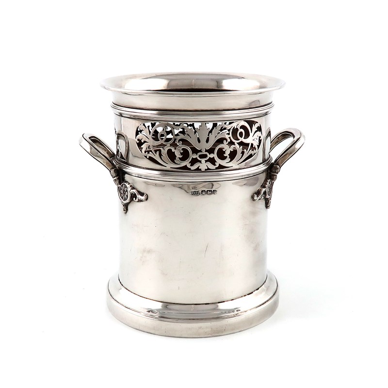 cylindrical form, pierced foliate scroll girdle, on a raised circular foot, the underside wood lined, height 16.3cm.