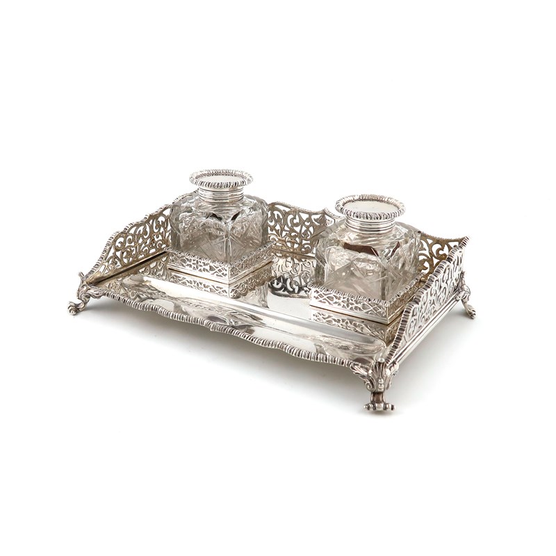 rectangular form, pierced foliate scroll gallery, with two silver-mounted glass inkwells, on four scroll feet, the underside lacking three nuts, length 23.5cm, approx. weight 19.5oz.