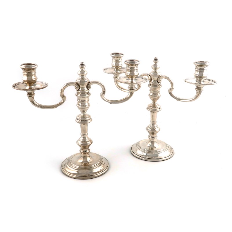 in the George I manner, knopped baluster stems, scroll arms, spool-shaped capitals, on raised filled circular bases, height 23cm, approx. weight of branches 19oz. (2)