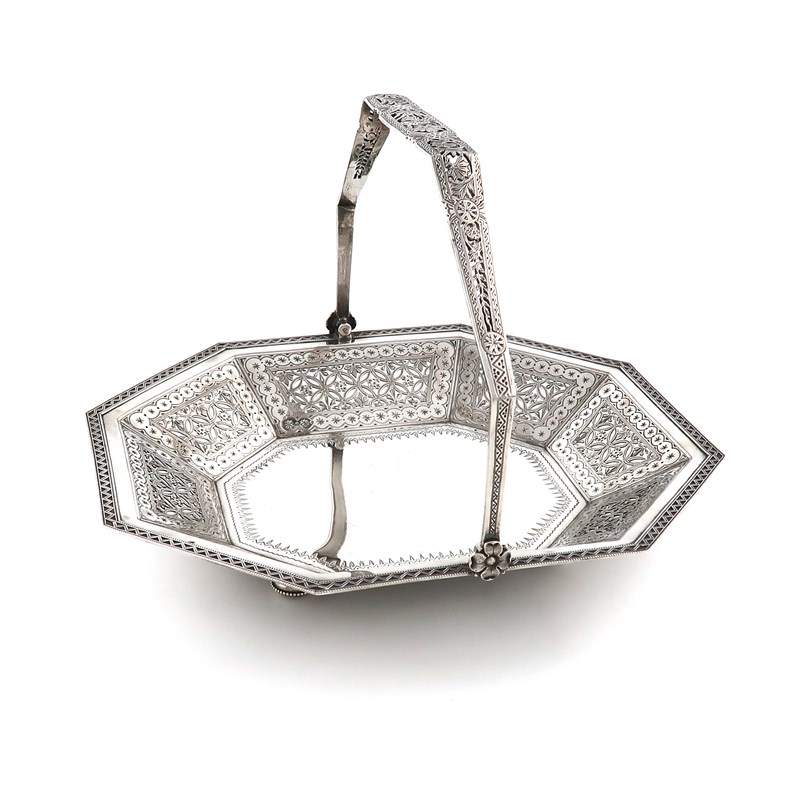 octagonal form, pierced bright-cut decoration, the swing-handle with pierced decoration, on four beaded bun feet, length 26.2cm, approx. weight 20.1oz.