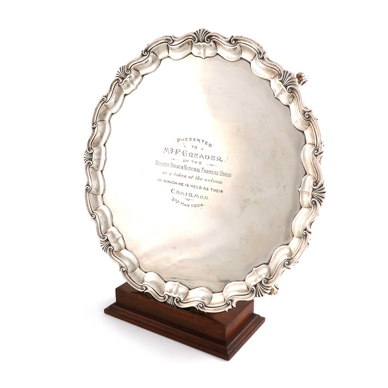 circular form, moulded border, on four gnarl feet, with a presentation inscription, and with a wooden stand, diameter 41.5cm, approx. weight 58.6oz. (2),