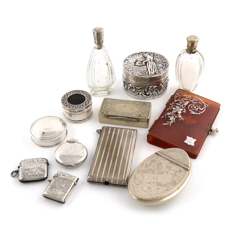 including: a continental box, of circular form, embossed with a figural scene, two scent bottles, two vesta cases, an unmarked vinaigrette of watch case form, a box with a tortoiseshell cover, another box, plus two snuff boxes, a cigarette case and a tortoiseshell aide-memoire cover. (qty)