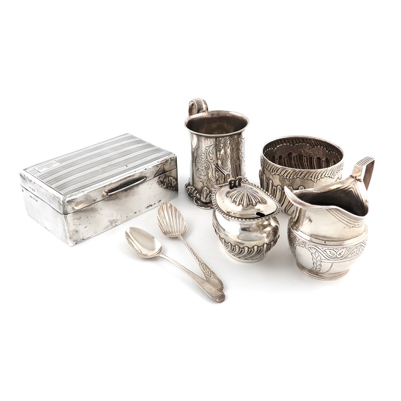 comprising: a Victorian mug, by Henry Wilkinson and Co, Sheffield 1851, a Victorian jug, a bowl, a mustard pot, a cigarette box, and two spoons, approx. weight 14oz. (7)