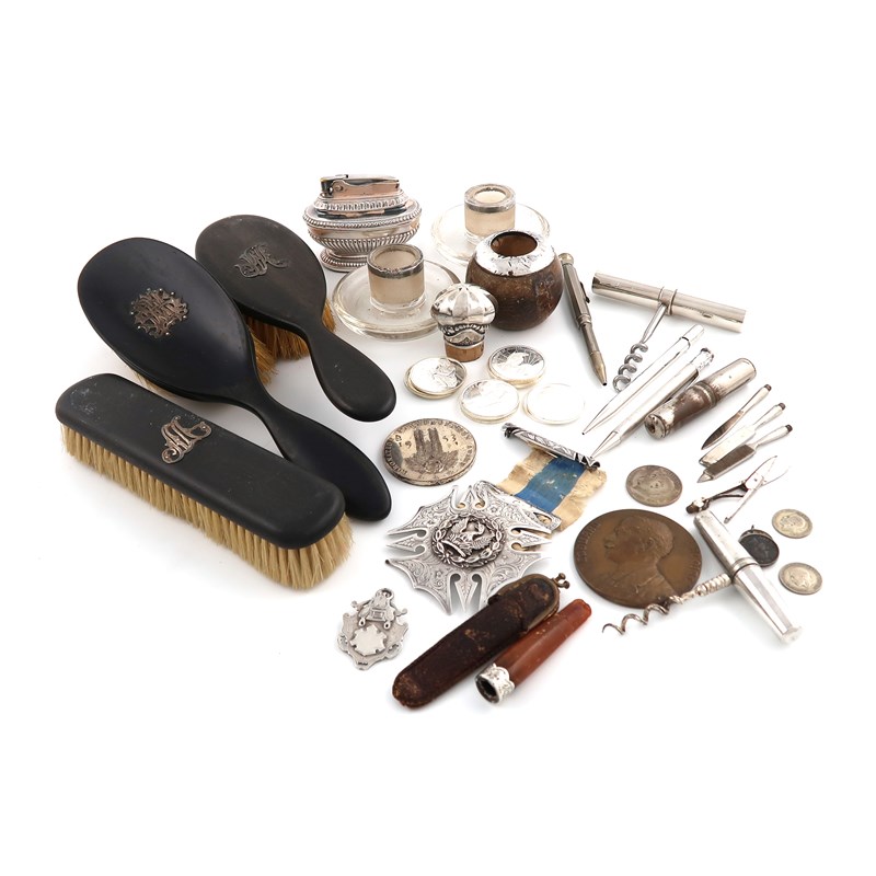 comprising: a Hoxton Lodge badge, London 1877, three table vesta holders, two corkscrews, various coins and brushes, and other items. (qty)
