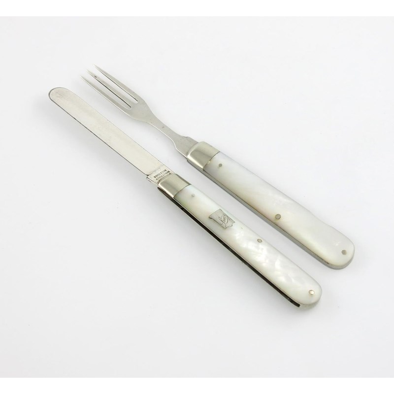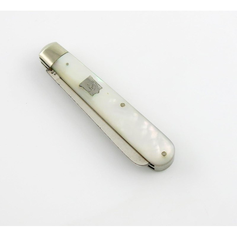 the plated steel blade by Singleton and Priestman, Sheffield, the two sections with a bayonet fitting, mother-of-pearl handles, engraved 'LUCY', length of knife open 14.4cm, closed 8cm.