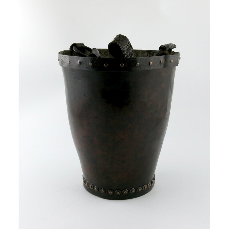 tapering circular form, the borders with copper rivets, with a strap handle, height 29cm.