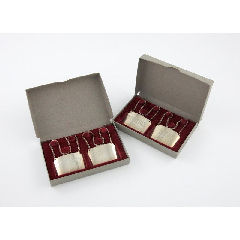 rectangular form, incurved corners, incised 'SHERRY', 'RYE', 'VODKA' and 'BOURBON', in two fitted cases. (4)