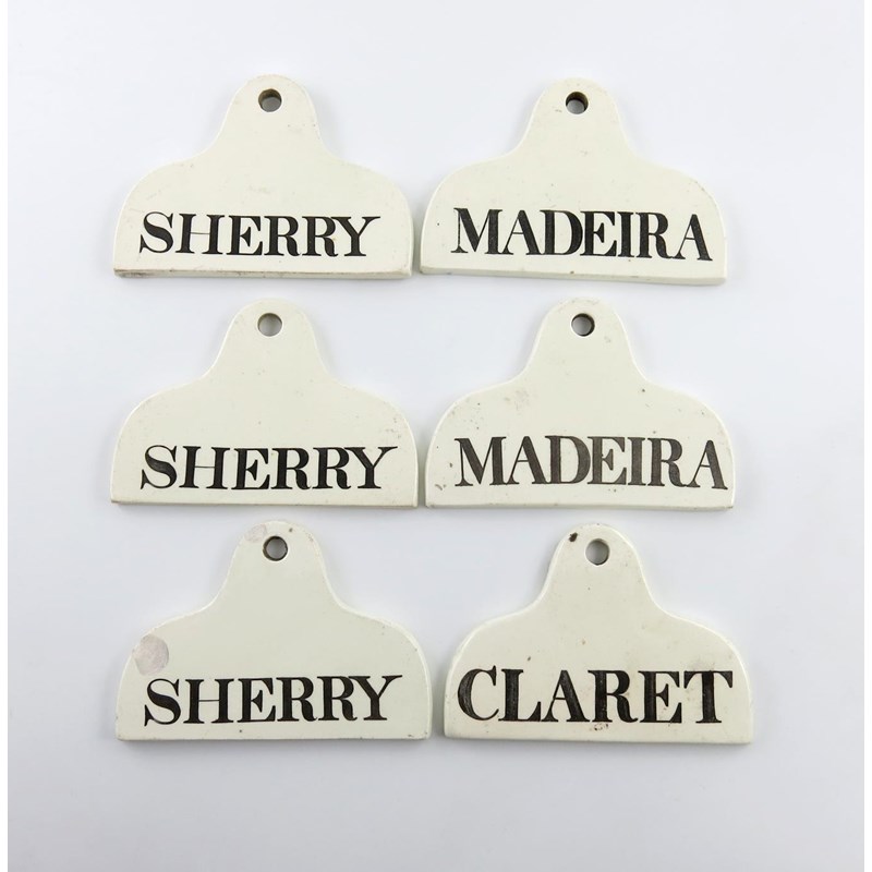arched rectangular form, titled in black 'CLARET', 'SHERRY' (x3), 'MADEIRA' (x2), length 13.5cm and 14cm. (6)