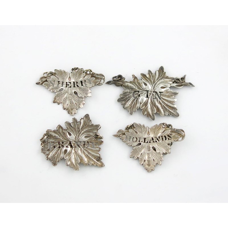 vine leaf form, comprising: pierced 'GIN', 'HOLLANDS', 'SHERRY' and 'BRANDY', approx. weight 1.2oz. (4)