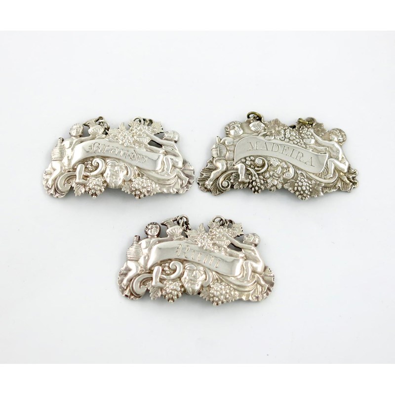 shaped form, with Bacchanalian cherubs, with a ewer, goblet and bottle, incised 'BRANDY' and 'RUM', length 6cm, plus a similar silver label, incised 'MADEIRA', approx. weight 1.4oz. (3)