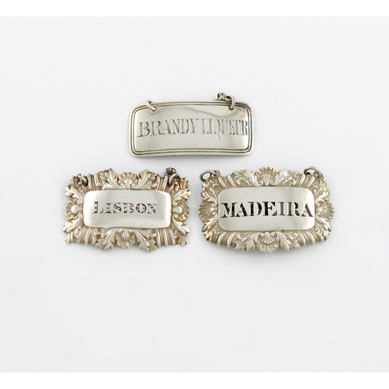 comprising: one Birmingham 1832, rectangular form, foliate and gadroon border, incised 'LISBON', plus one 'BRANDY LIQUEUR', London 1821, and one pierced 'MADEIRA', approx. weight 0.8oz. (3)